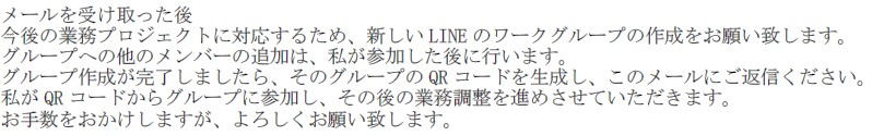 確認されたメールの特徴は、当グループ代表名を名乗りLINEグループの作成を依頼、QRコードの生成や返信を求める、不自然な内容の依頼や業務と無関係な指示、といったものです。